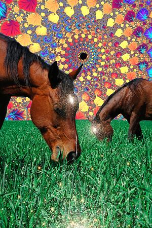 Horses are special magical animals to me and I have been connected to their spirits before birth. My process for selecting images for collage is led by connecting with something emotional or intuitive in my soul. These two horses nourishing themselves in this vast green pasture struck resonates with me. It inspires in me the feeling of being completely grounded in the Universe as an endogenous life-form that is fed and sustained by the structure and fabric of reality. Like the Mandelbrot fractal set used in the background, we’re living in a walled garden of matter and form amidst swirling infinite sea. Animals, free of egos, are connected with this reality, embrace their place in the Cosmos, and without question, allow that infinite life to flow to them and flourish.